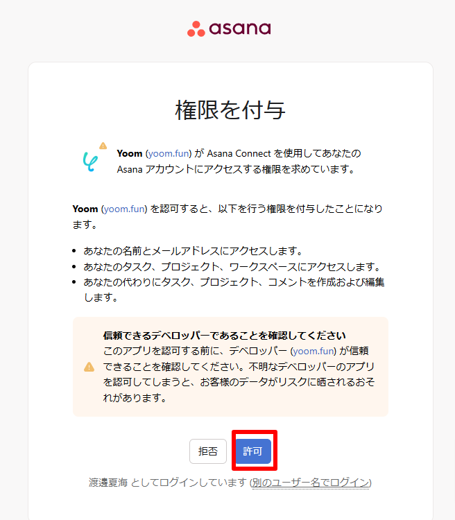 ログインができると、Yoomへの権限の付与の確認が行われるので「許可」をクリックしてください。