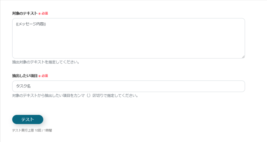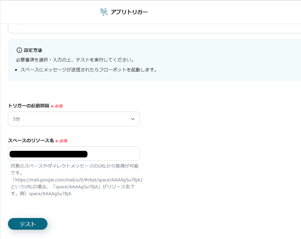 設定ができたら「テスト」をクリックして、Google Chatのメッセージ内容が正しく読み取れるか確認します。