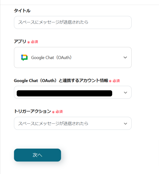 最初は「スペースにメッセージが送信されたら」でGoogle Chatの設定を行います。