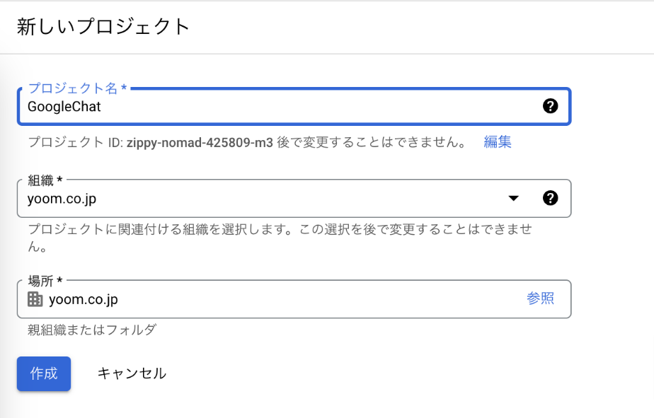 Google Cloud Platformにログイン後、新しいプロジェクトを作成してプロジェクト名などを入力して下さい。