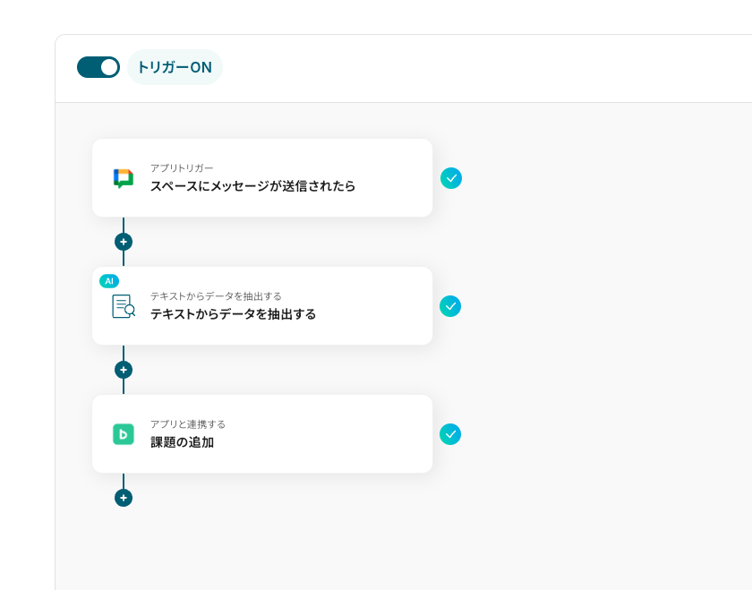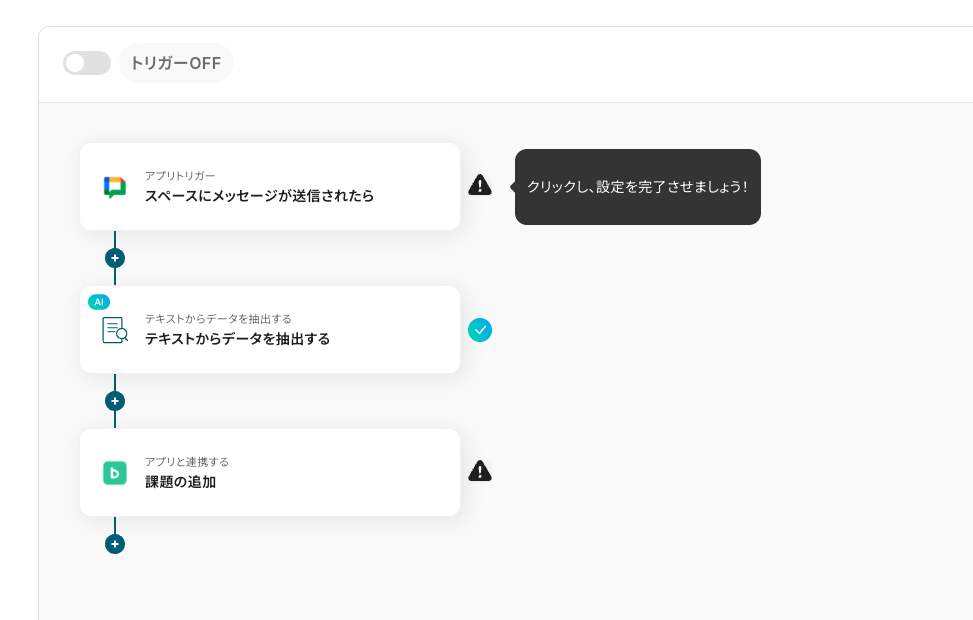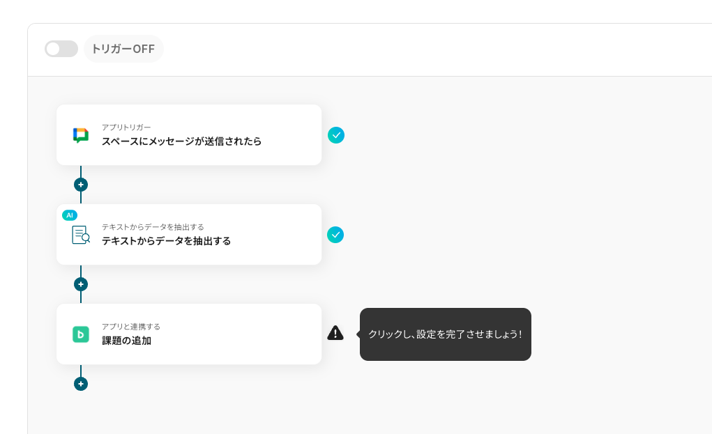 この工程では、Google Chatのメッセージから課題と詳細内容をAIが判断して抽出する設定を行います。設定済みの証(水色のチェックアイコン)が点灯していますが、設定内容を確認するためクリックしましょう。