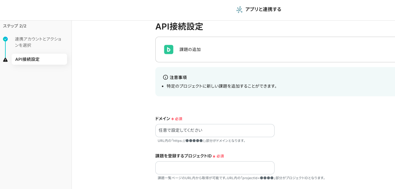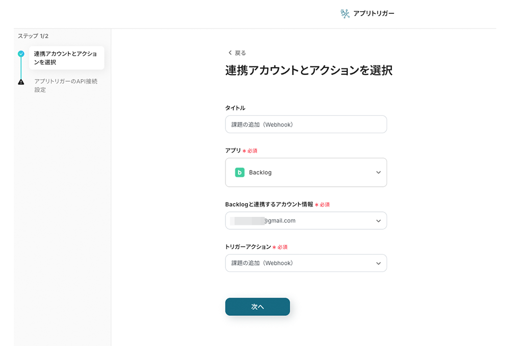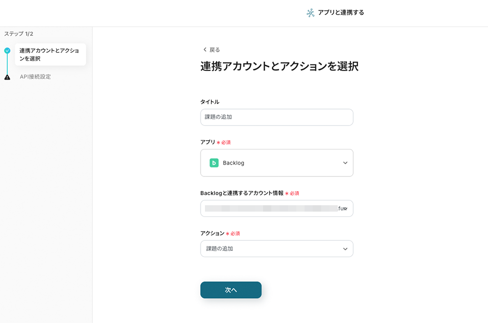 テンプレートの3つ目の工程、「課題の追加」をクリックします。この工程では、Backlogに課題を自動追加するための設定を行います。
