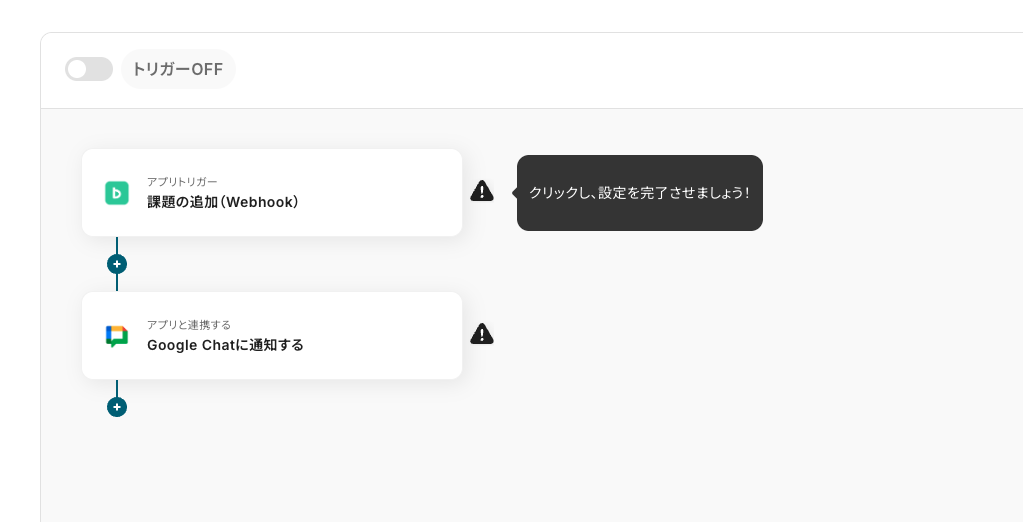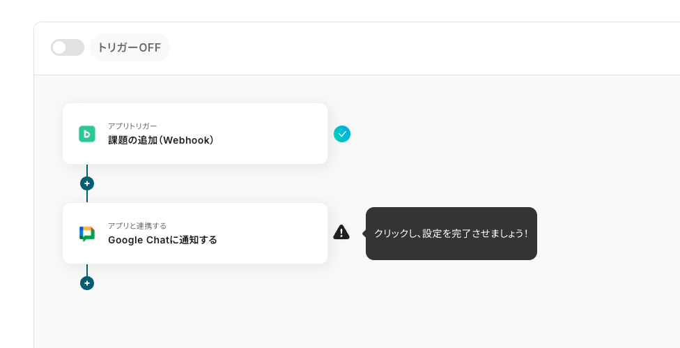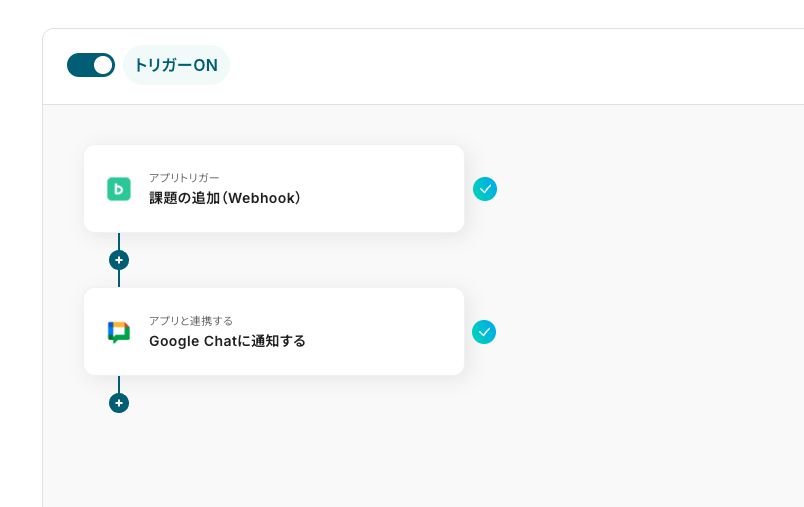 トリガーのON/OFFは左上のトグルから切り替えが可能です。プログラミング不要で、フローボットの設定が簡単に完了しました。Google ChatやBacklogのAPIを使ったその他の自動化例