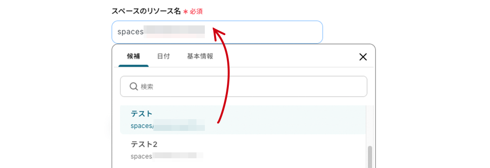 入力欄をクリックすると、連携しているアカウントからスペースの候補が表示されます。候補からスペースを選択すると、入力欄にリソース名が表示されます。