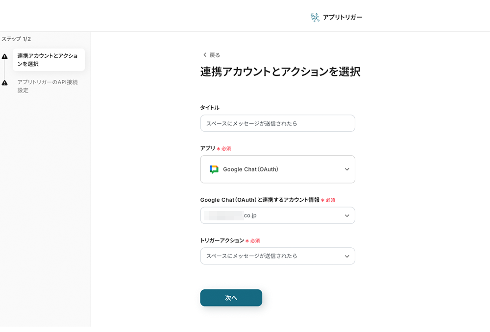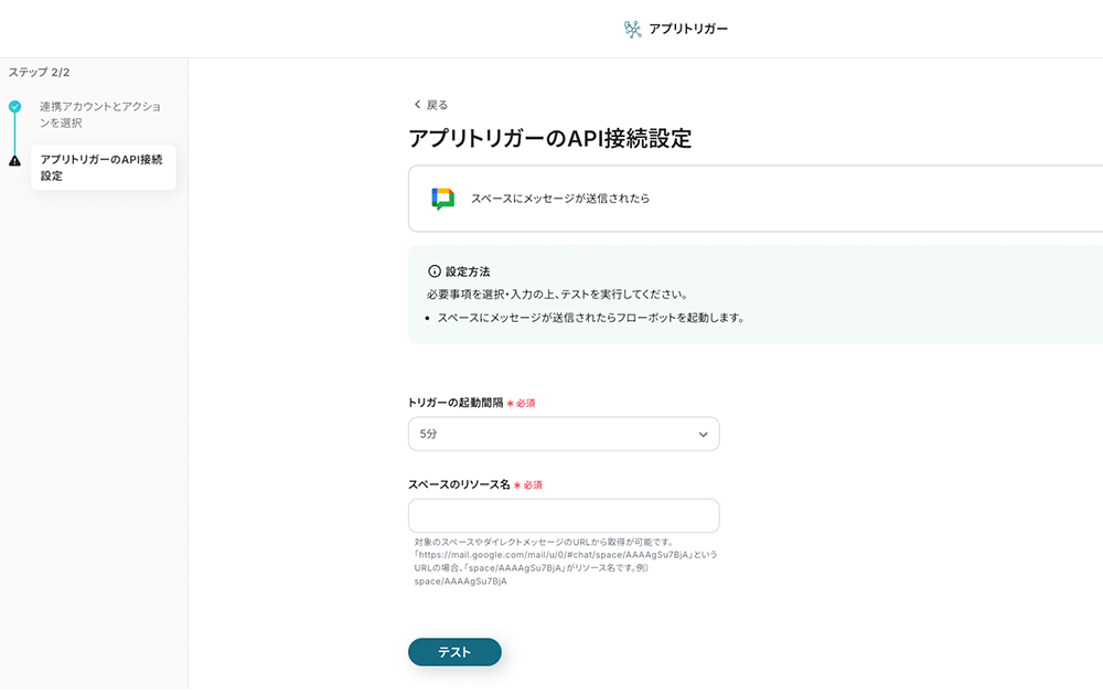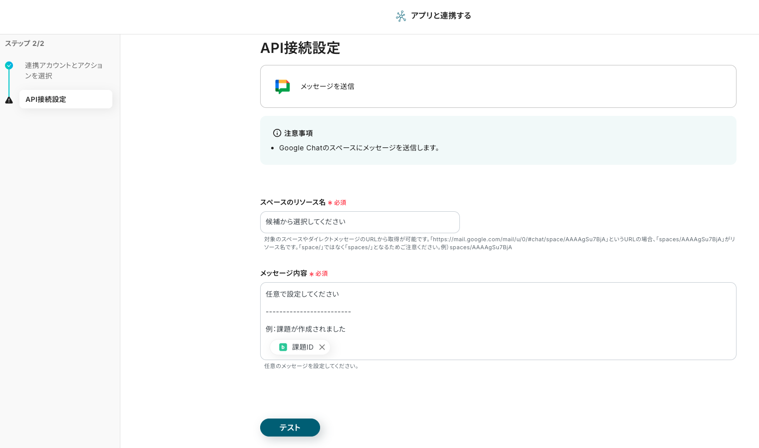 必須項目の入力ができたら「テスト」をクリックします。成功すると、Google Chatにメッセージが送信されます。ステップ3(最終):アプリトリガーをONにする