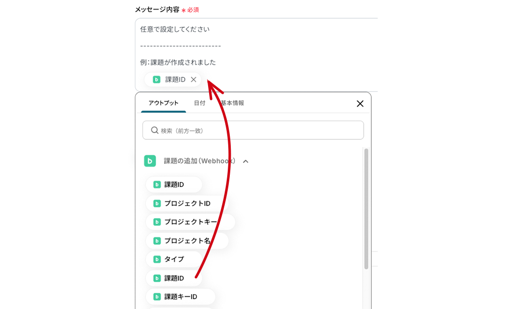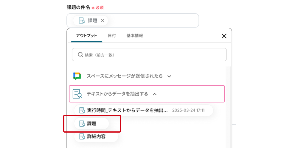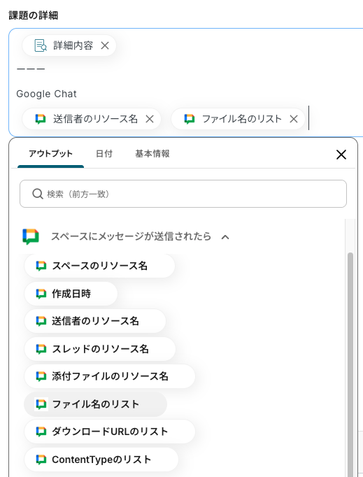「課題の詳細」の入力欄をクリックしたら表示されるプルダウンメニューから、Google Chatと「テキストから抽出した」アクション設定時に取得した値を用いて設定しましょう。