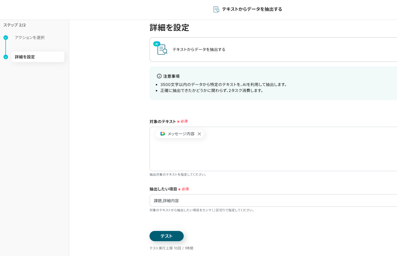 入力が終わったら、「テスト」ボタンをクリックします。テストが成功すると、Google Chatのメッセージ内容から「課題」と「詳細内容」をAIが自動抽出し、取得した値として利用できます。この値を使ってBacklogの課題を自動作成します。テスト成功後、保存しましょう。ステップ5:Backlogに課題を追加するアクション設定