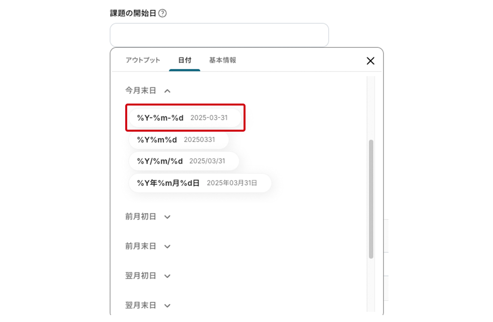 両方とも任意ではありますが、もし設定するなら動的コードの引用がおすすめです。「入力欄をクリック>日付タブ>指定の形式」の手順で設定できます。