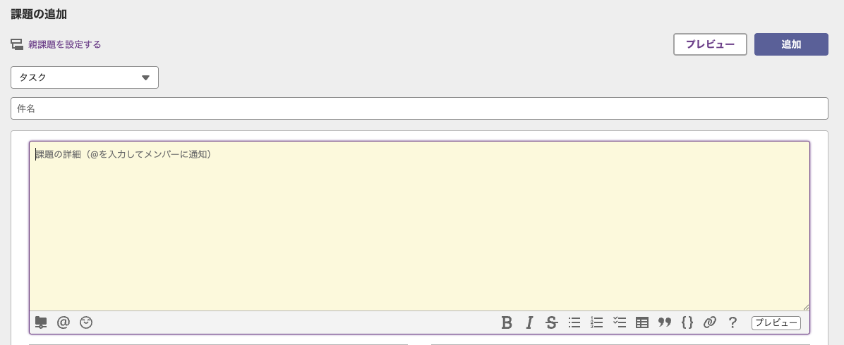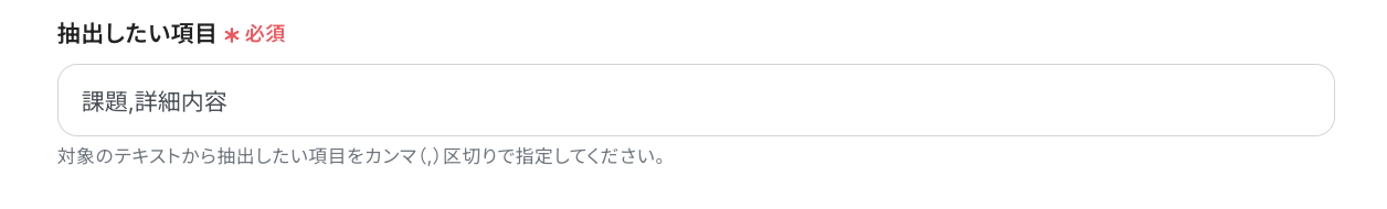デフォルトの設定で、「課題」「詳細内容」が設定されています。他の項目を追加する場合は、単語の間に(,)を追加してください。