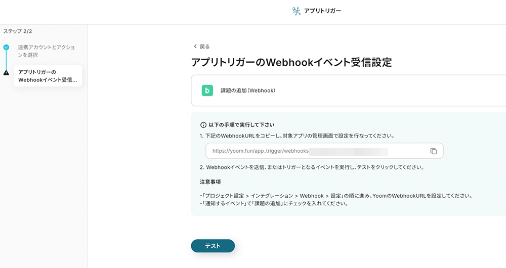 設定が完了したら「テスト」ボタンをクリックします。成功すると、Backlogに課題が追加されるので、正しく課題が追加されていることを確認しましょう。確認後、保存してください。ステップ6(最終):アプリトリガーをONにする