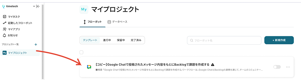 コピーしたテンプレートは、「マイプロジェクト」に追加されます。マイプロジェクトは左のメニューバーからアクセスできます。