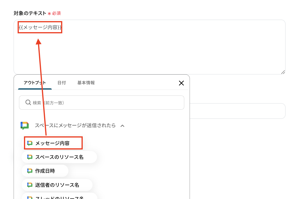 デフォルトの設定で、「対象のテキスト」欄にGoogle Chatから取得した「メッセージ内容」の値が入力されています。