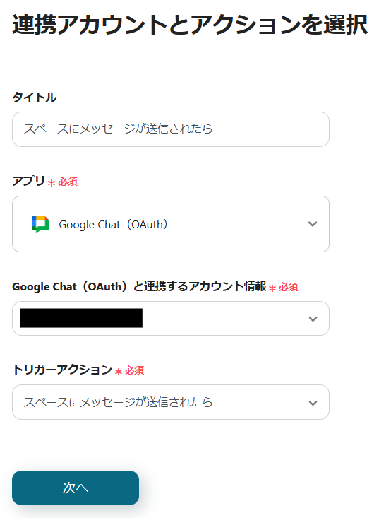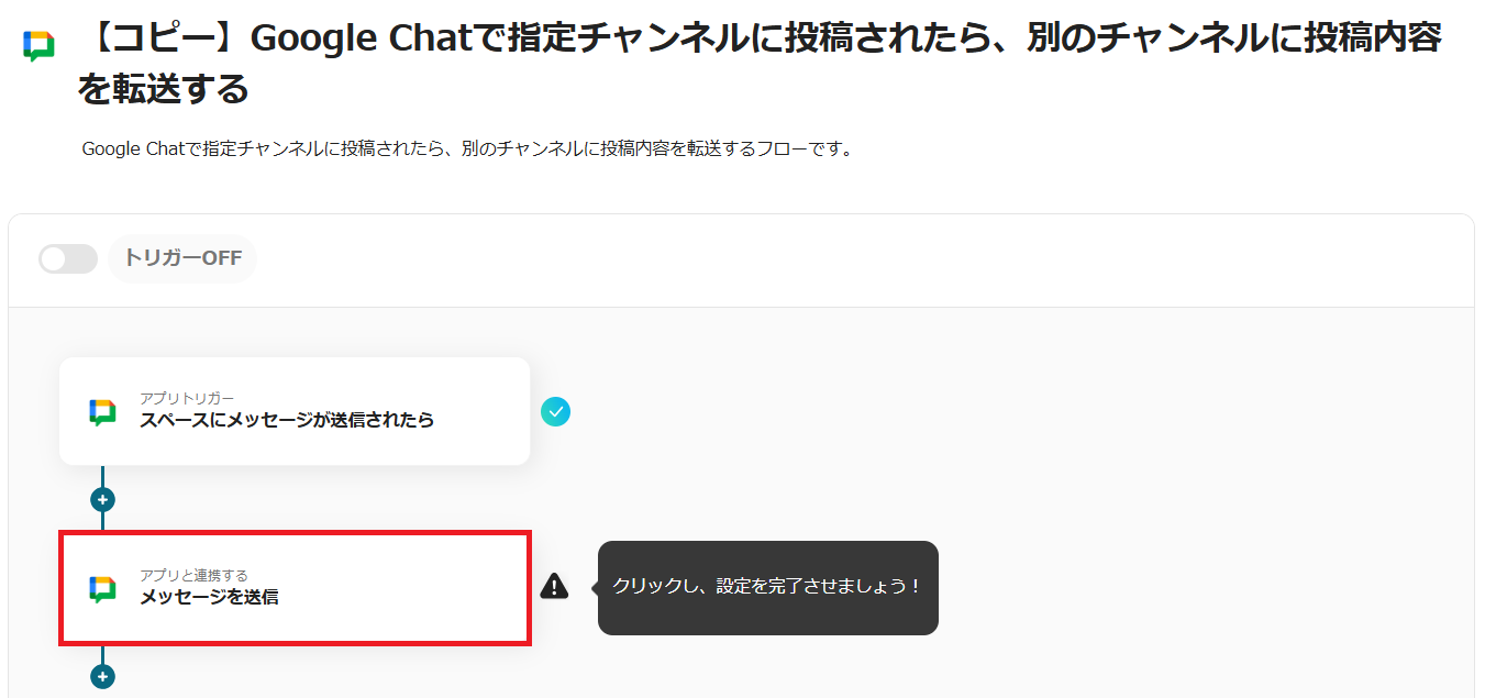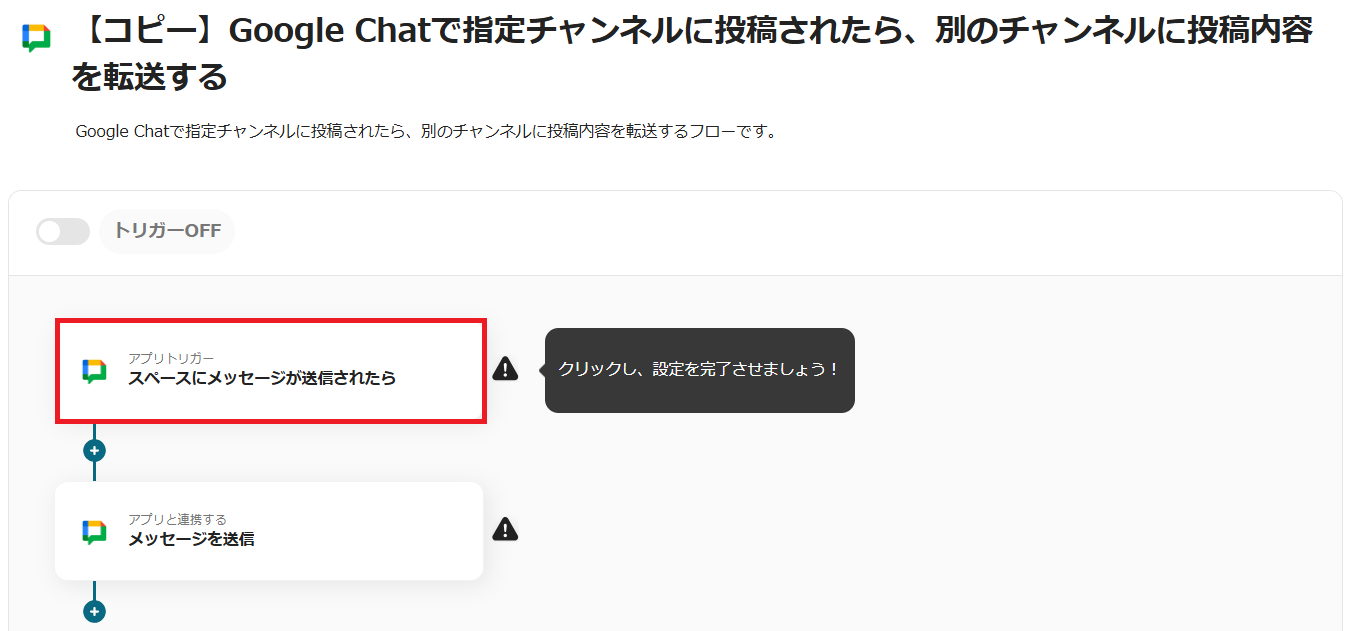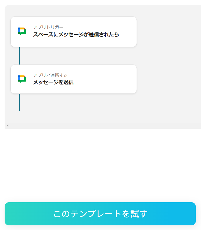 このフローではGoogle Chatで指定スペースにメッセージが投稿されるとトリガーが起動します。
