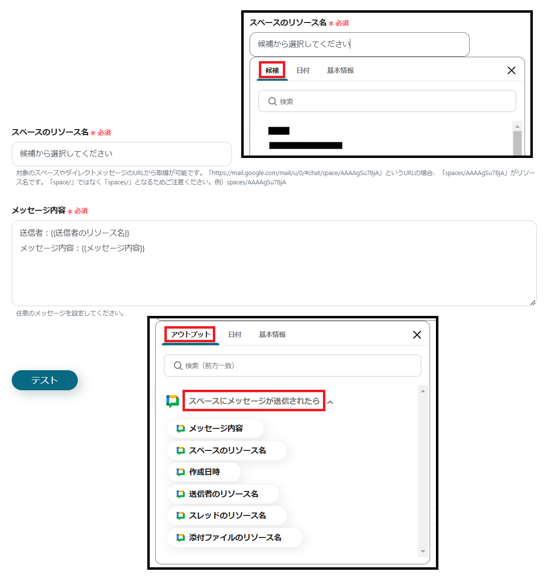 3.スペースのリソース名、メッセージ内容を設定し、テストを行います。