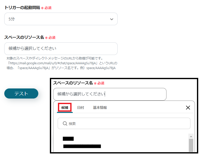 4.トリガーの起動間隔とスペースのリソース名を設定し、テストを行います。