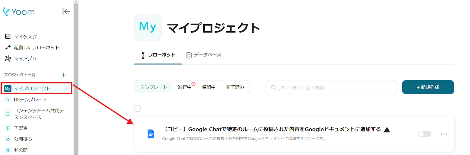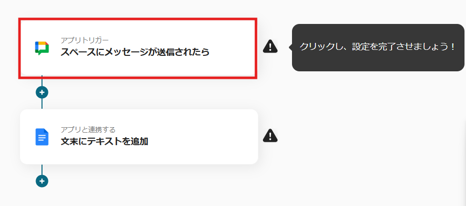 ここからは、Yoomのテンプレート【Google Chatで特定のルームに投稿された内容をGoogleドキュメントに追加する】という連携フローを使って設定をしていきます。