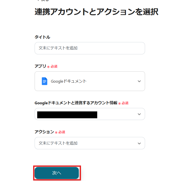 2) アクションは「文末にテキストを追加」を選択し、「次へ」をクリックします。