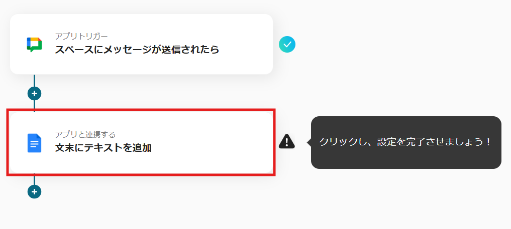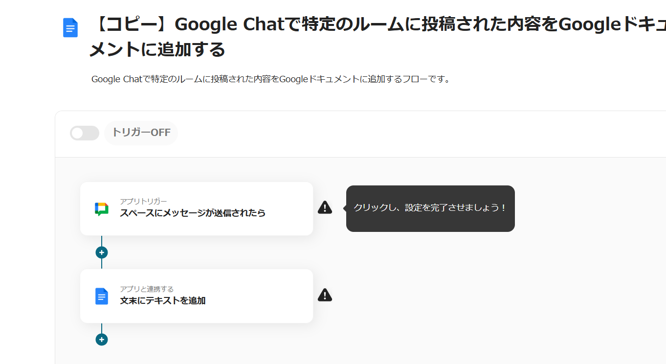 これで【Google Chatで特定のルームに投稿された内容をGoogleドキュメントに追加する】というフローが完成です。