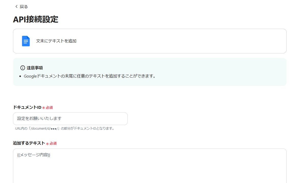 事前にGoogle Chatの情報に対応するGoogleドキュメントを作成する必要があります。