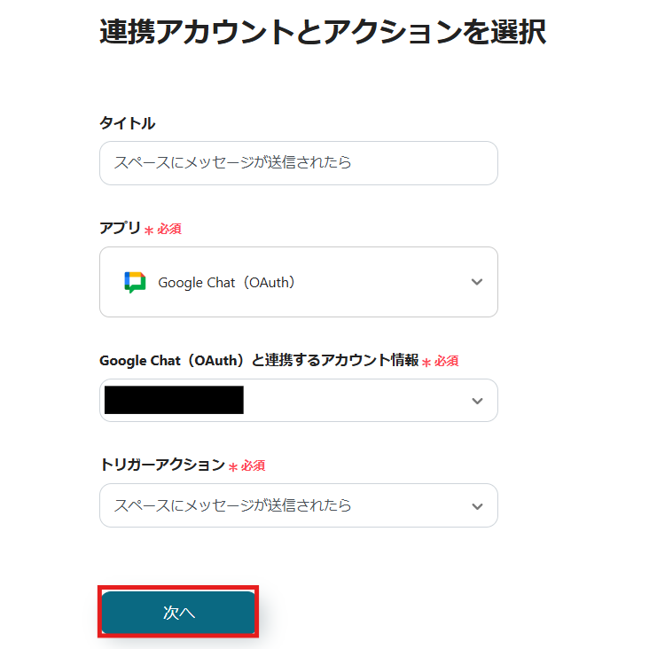 1) アクションは「スペースにメッセージが送信されたら」を選択して、「次へ」をクリックします。