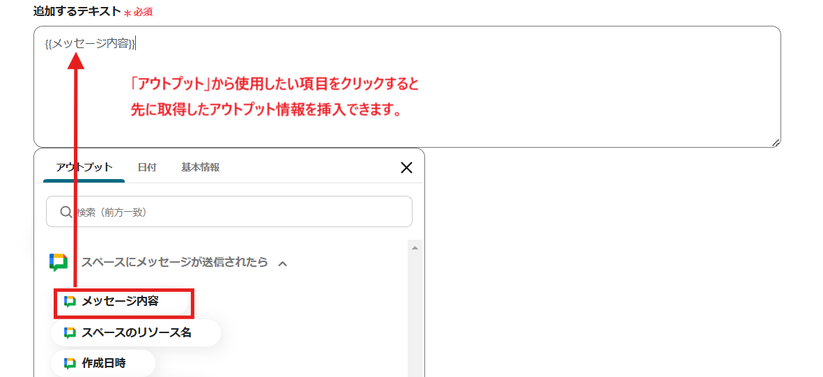 アプリが連携出来ているとGoogle Chatのアウトプット情報を活用して入力できます。