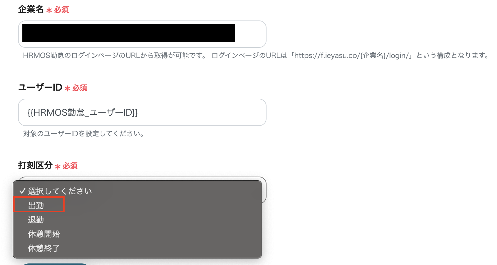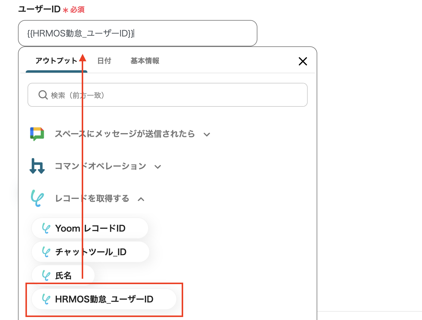 (今回は、Yoomのデータベースに事前に設定した『HRMOS勤怠_ユーザーID』の値を設定しています。)