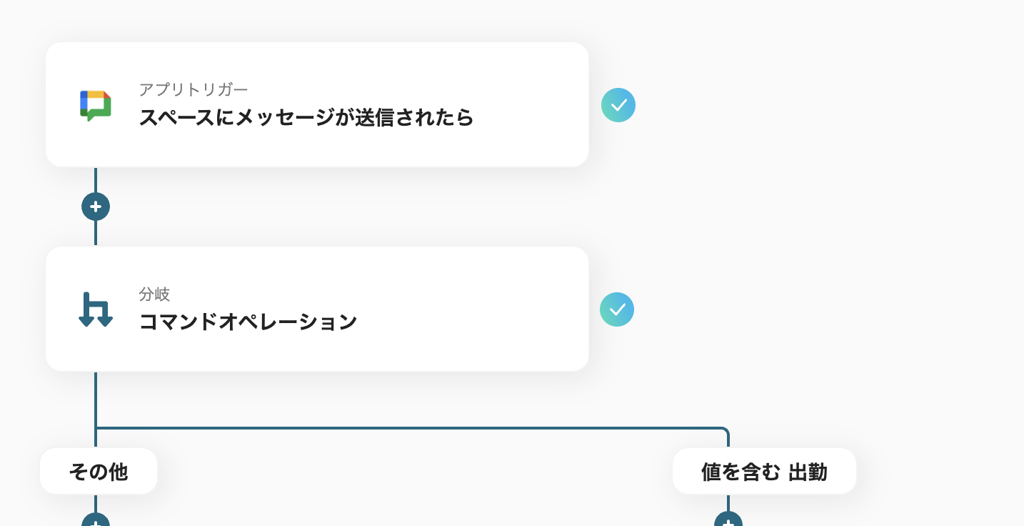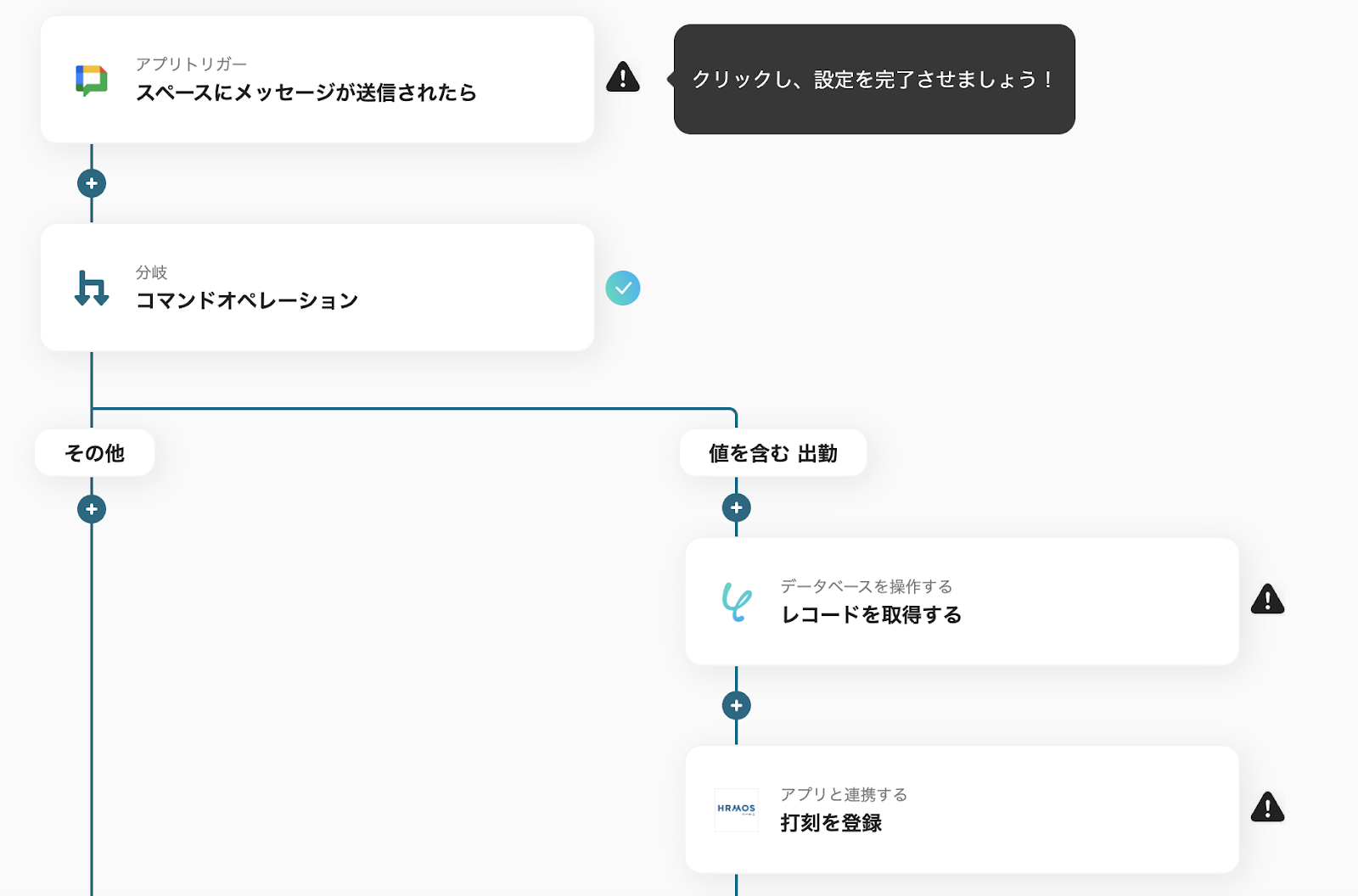 ・Google Chatのトリガー設定と分岐アクションの確認、続くHRMOS勤怠の各オペレーションの設定