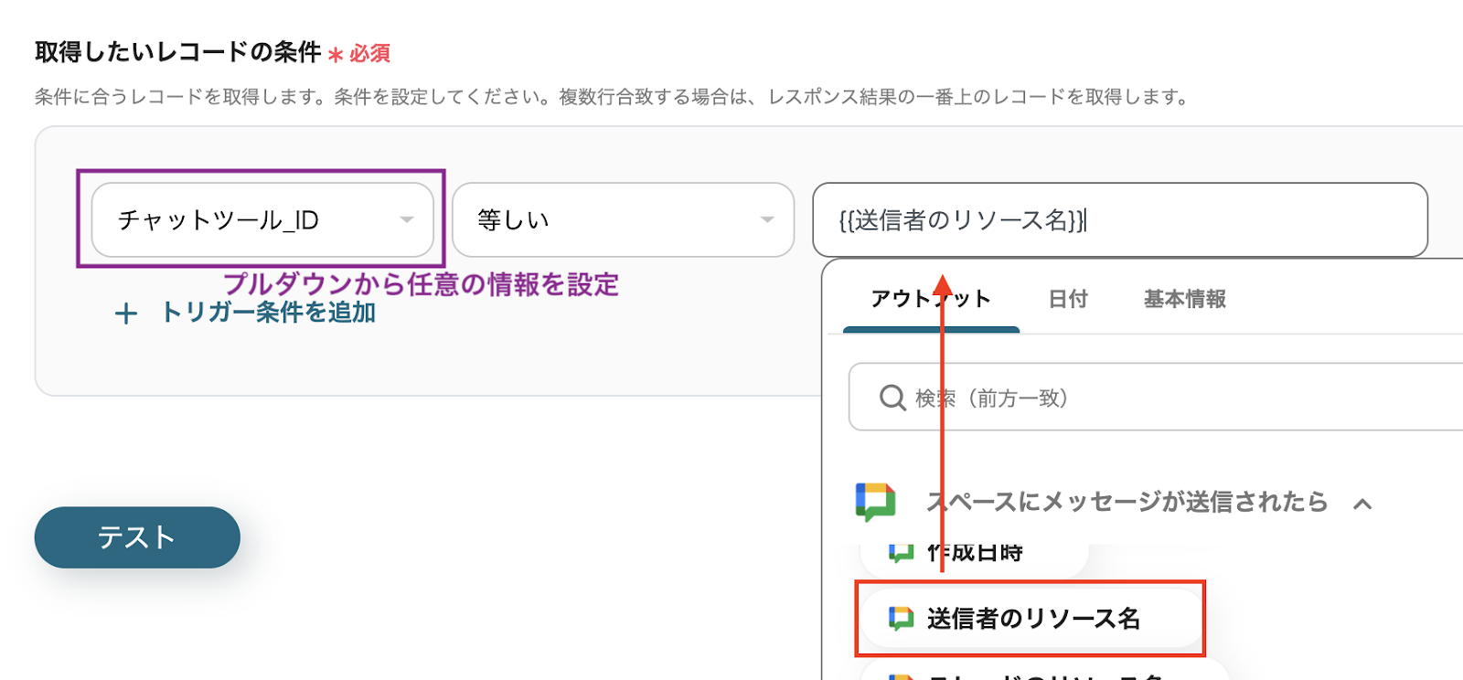 今回は「チャットツールIDが等しいと判断されると、送信者のリソース名の情報を取得する」と仮定し、設定を行っています。