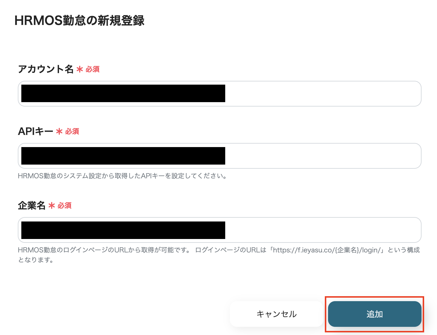 (3)連携するHRMOS勤怠の「アカウント名」と「APIキー」、「企業名」を入力し、[追加]をクリックします。