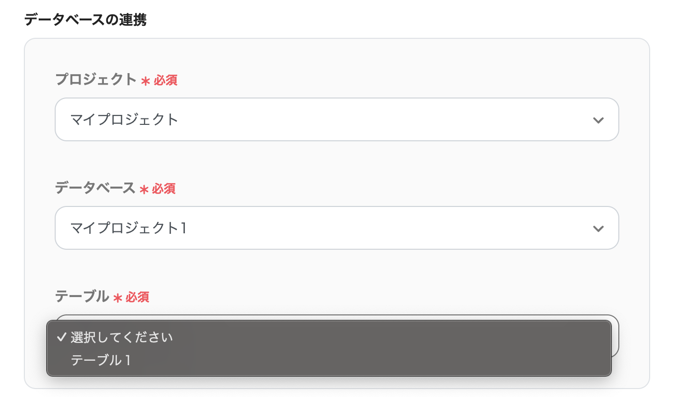 『データベースの連携』では、対象とする「プロジェクト」、「データベース」、「テーブル」を、それぞれプルダウンから選択してください。