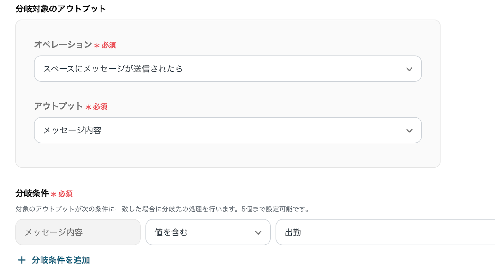 (2)以下の画面のように、このテンプレートでは、分岐対象のアウトプットとして「オペレーション:スペースにメッセージが送信されたら」→「アウトプット:メッセージ内容」を対象として指定しています。