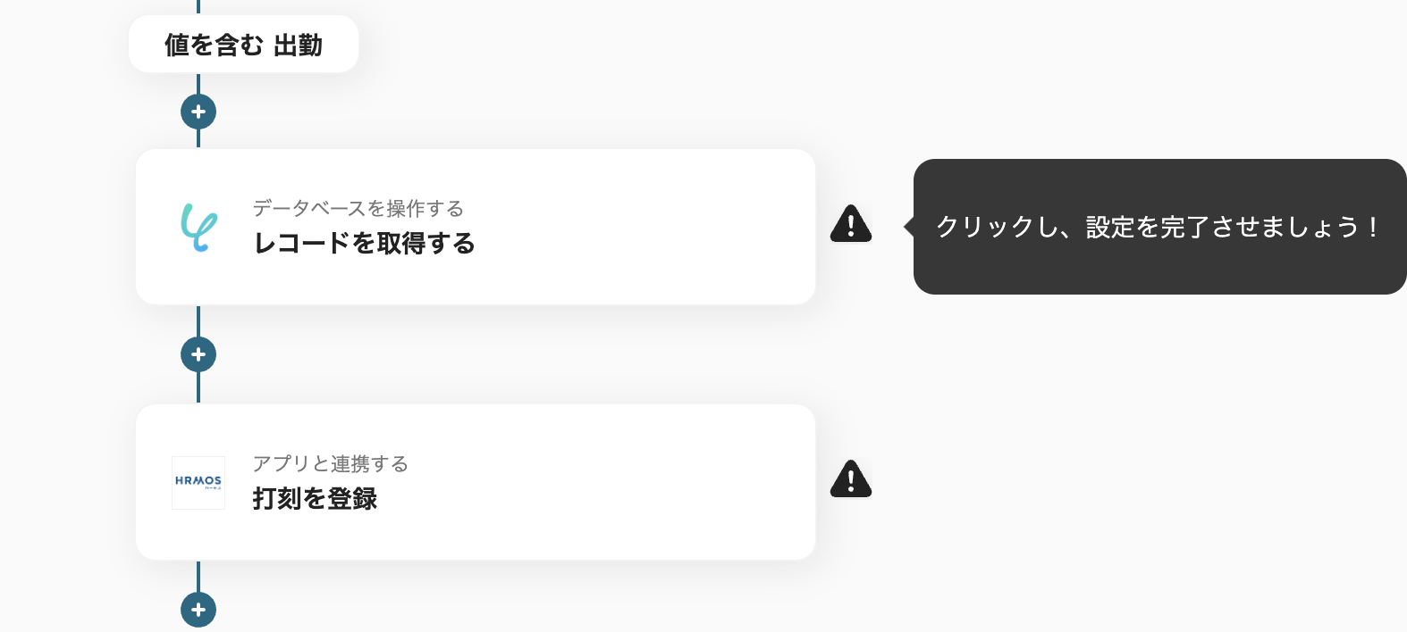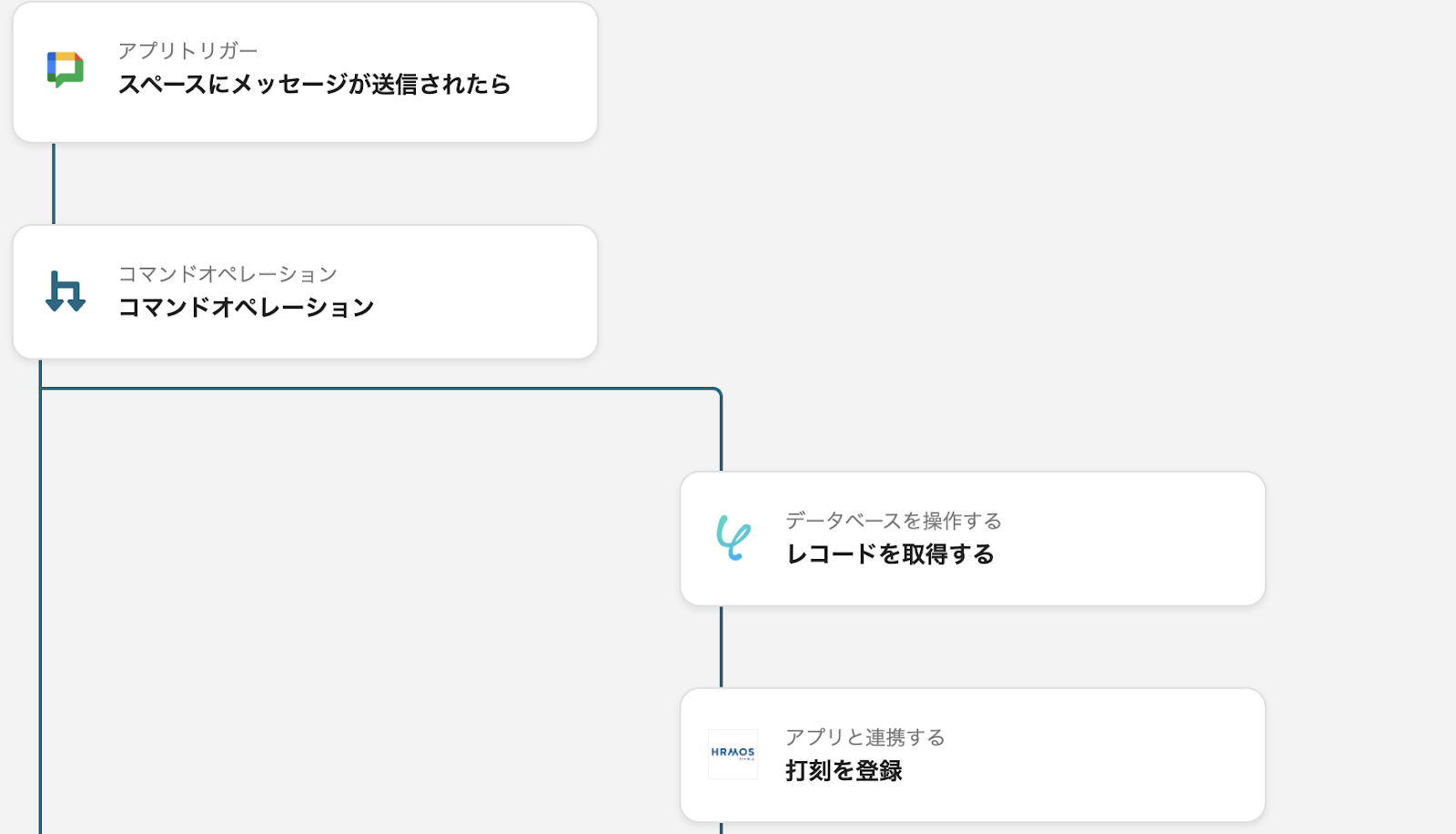 ※このフローはYoomのデータベースを連携させるアクションがあるので、テンプレートを使用する前に【Google Chatの送信者のリソース名】や【チャットツールID】、【HRMOS勤怠のユーザーID】を各データベースに登録・設定しておく必要があります。
