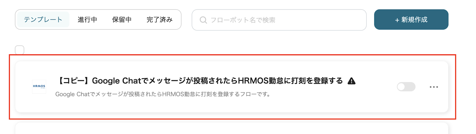 では、「Google Chatでメッセージが投稿されたらHRMOS勤怠に打刻を登録する」のテンプレートを使ったフローボットを作成していきましょう。