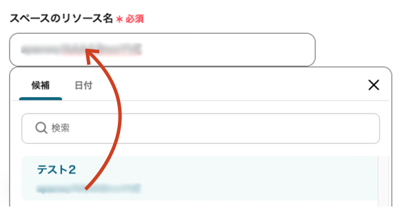 - 編集欄をクリックで、プルダウンが開きます。プルダウン内には、候補のスペース名がピックアップされますので、該当のスペースを選択。リソース名が自動で引用されます。