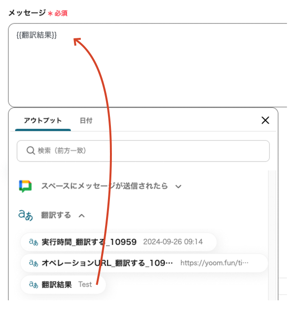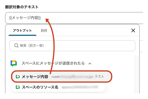 - 編集欄をクリックするとプルダウンが開き、Google Chatで抽出したアウトプットが表示されます。メッセージ内容が翻訳対象になるため、選択します。引用コードが埋め込まれます。