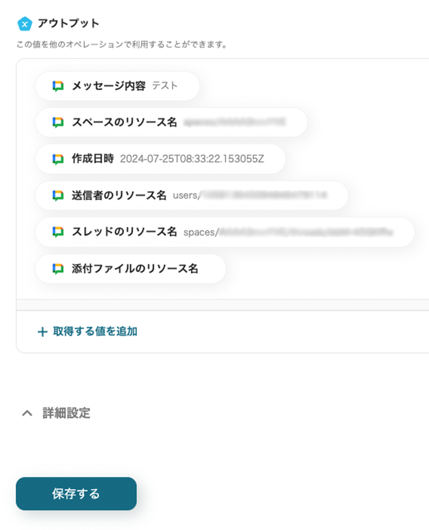 →テストをクリック →成功 アウトプットにはメッセージの内容や作成日時が抽出されていました。