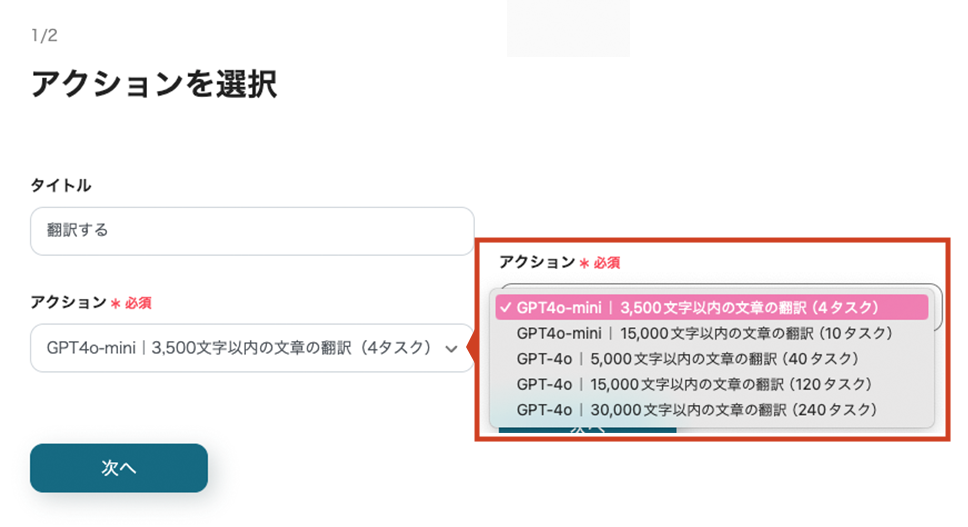 タイトルと連携するアカウント情報を任意で設定し、アクションはテンプレート通りのまま「次へ」をクリックして進んでください。