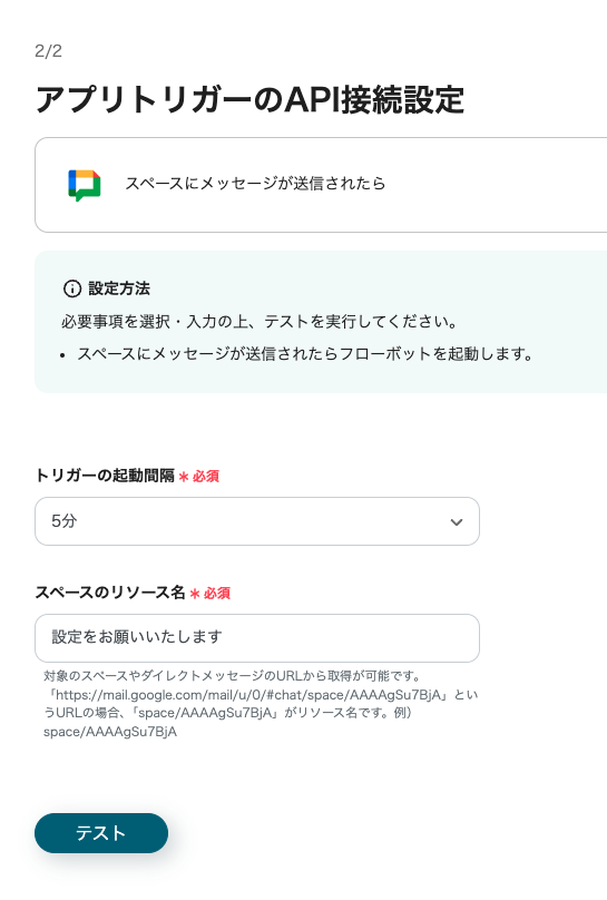ステップ2 アプリトリガー「スペースにメッセージが送信されたら」