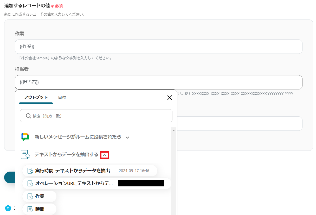 Notionで設定した項目名が表示されたら、赤枠をクリックして、該当のアウトプットを選択します。