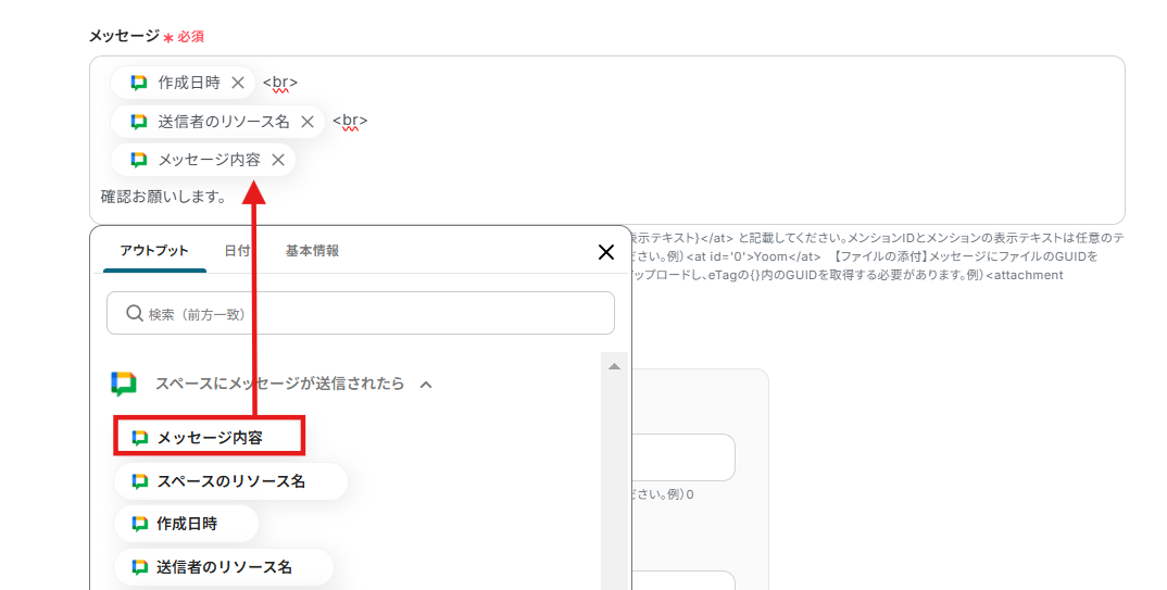 4.アウトプットを活用して、「メッセージ」を入力欄下の注釈を参考に入力しましょう。