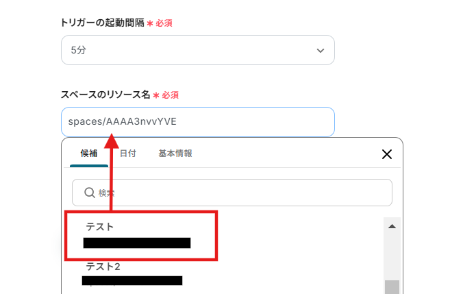 4.スペースのリソース名(通知されるチャット)を選択します。クリックすると下に候補が表示されます。