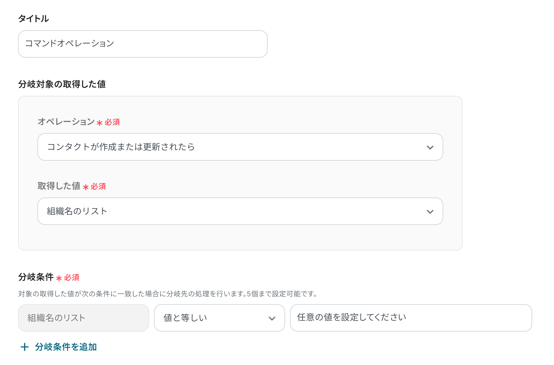 「コマンドオペレーション」の分岐をクリックしてください。ここでは、組織名のリストに応じてその後のフローを進めるか否かを判断します。