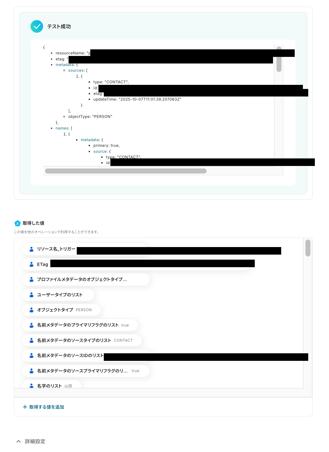 テストが成功するとテスト成功画面と取得した値が表示され、Googleコンタクトのデータが確認できます。「保存する」をクリックして完了です!