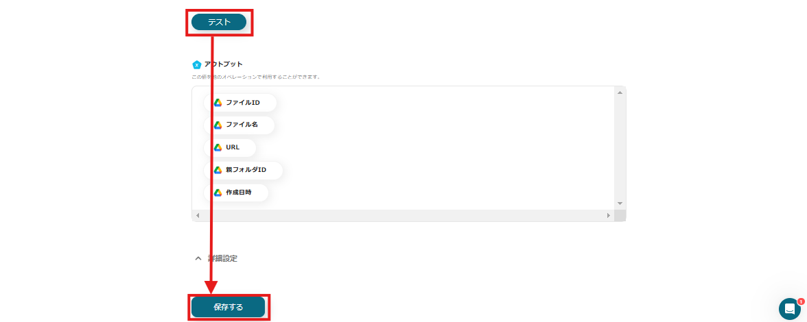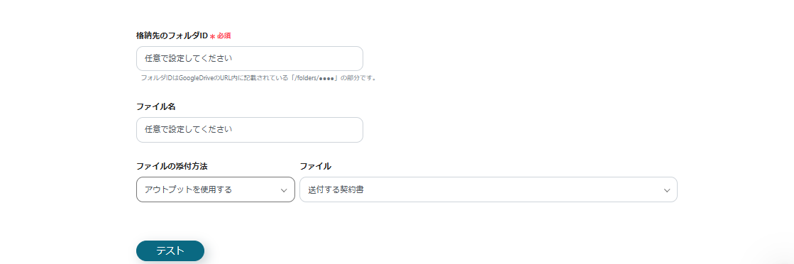格納先のフォルダIDとファイル名は、枠外の注釈を参考に設定してください。