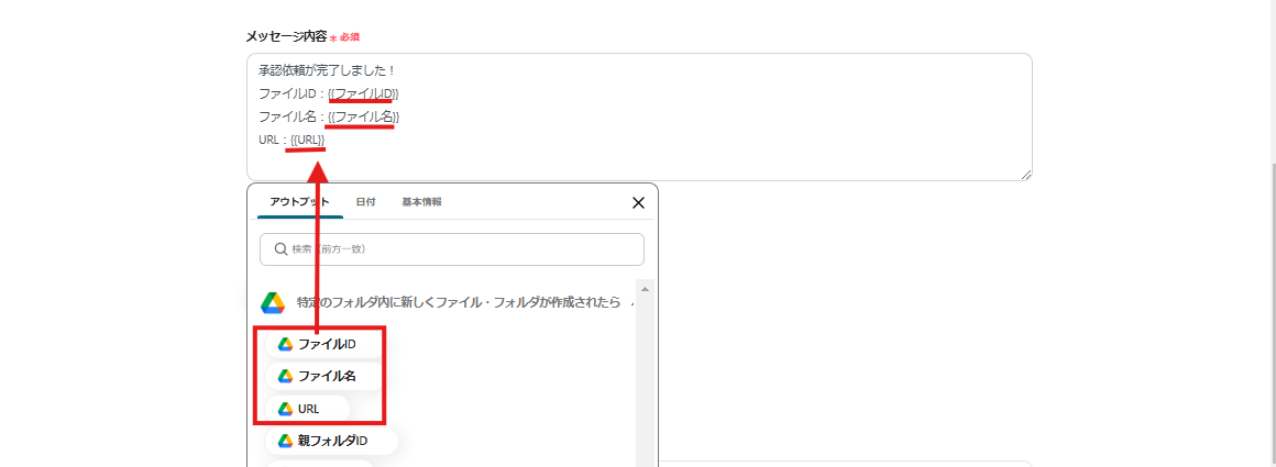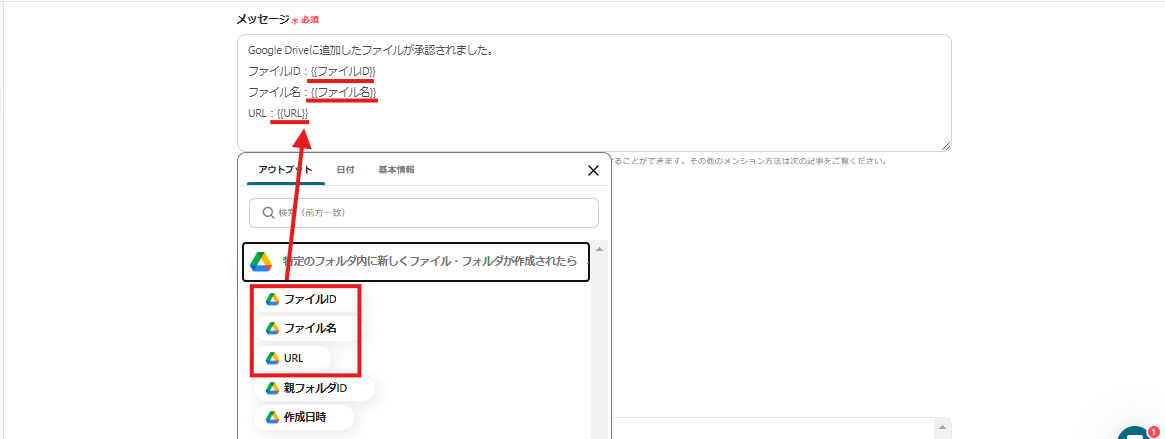 例えば、上記画像のように設定すると、Google Driveに追加したファイルの「ファイルID」「ファイル名」「URL」を自動で取得し、Slackのメッセージに引用できます。