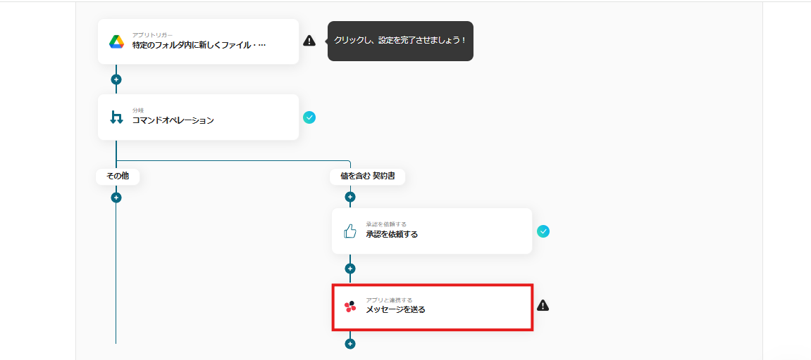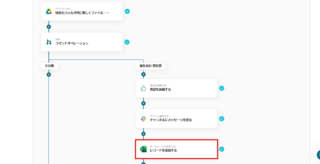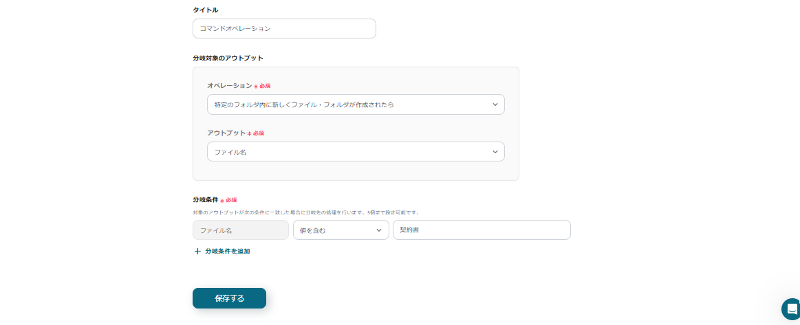 分岐条件は、ファイル名に「契約書」というワードが含まれている場合に分岐するよう設定されています。