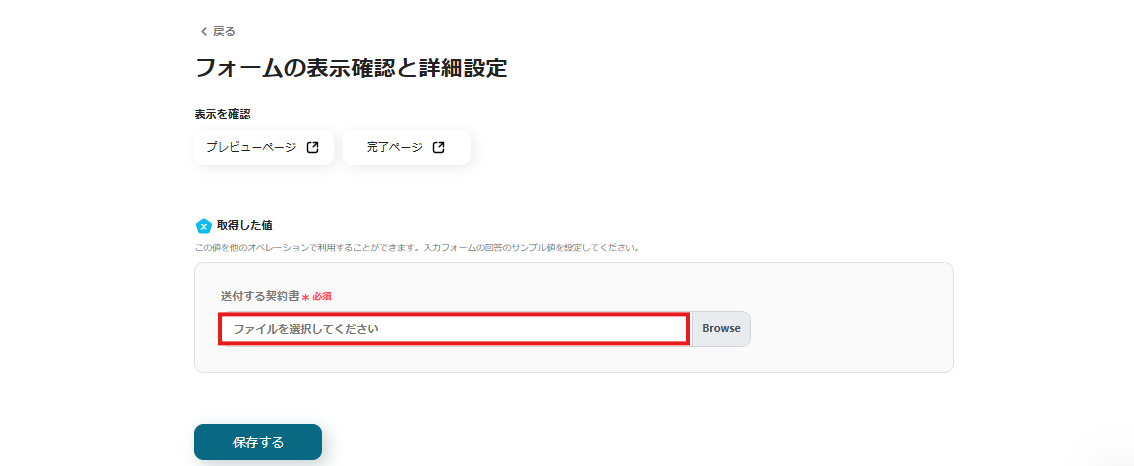 赤枠部分をクリックし、テスト用の書類ファイルを添付後「保存する」をクリックしてください。