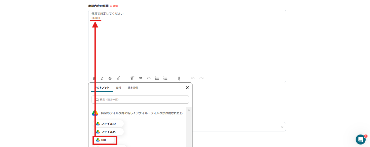 このように設定することで、Google Driveに作成されたファイルのURLを自動で引用できます。