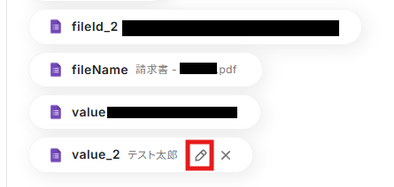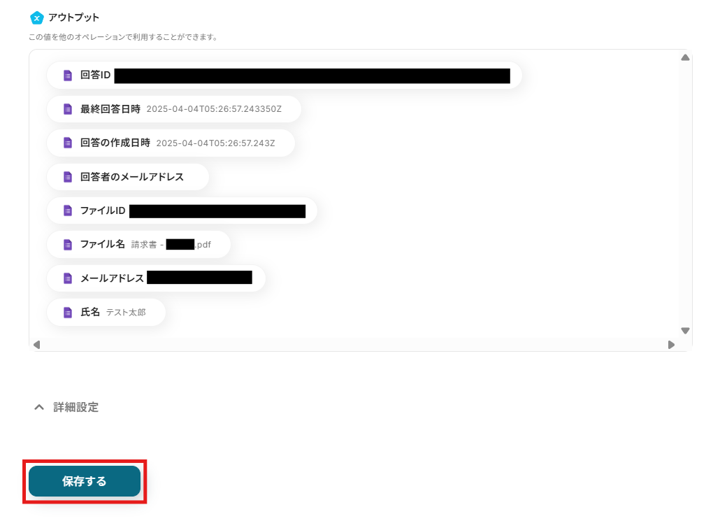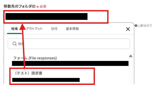 入力欄をクリックして表示される「取得した値」から、Googleフォームの設定で取得したファイルIDを選択しましょう。
