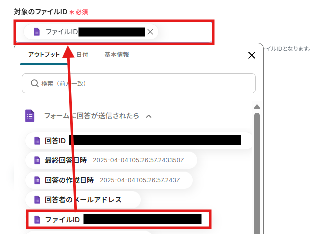 入力欄をクリックして表示される「アウトプット」の、「フォームに回答が送信されたら」内にあるファイルIDを選択しましょう。